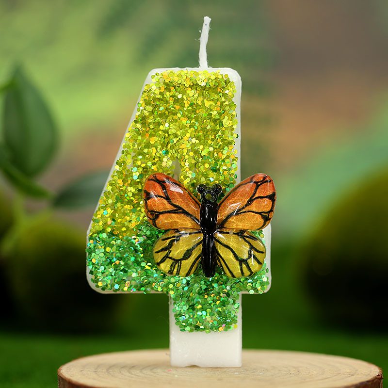 Make birthdays unforgettable with our Glitter birthday candles, featuring an eye-catching glitter design and an elegant butterfly accent. These candles are crafted to add a touch of sparkle and sophistication to birthday cakes. Each number is coated with vibrant green glitter and adorned with a lifelike butterfly, making it ideal for nature-inspired or spring-themed celebrations.